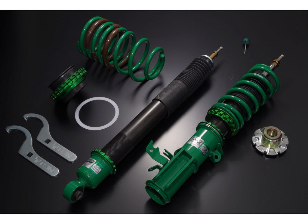 The Tein Flex-Z range are incredible, height adjustable coilovers made with Tein's famous "Made in Yokohama" quality. Considering the use of larger tires/wheels and the lowered ride height, FLEX Z uses twin-tube system, in pursuit of ride comfort on streets. In order to maintain the ride quality on streets with rough spots here and there, a shock absorber has to have sufficient stroke, be low-frictional and move smoothly. As an oil chamber and a gas chamber are not arranged serially in a twin-tube system, it is easy to secure enough stroke. Also, low gas pressure keeps friction low. Its smooth stroke movement makes it possible to follow rough and bumpy road surfaces quite well, offering supple ride at low speed and stable ride at high speed.